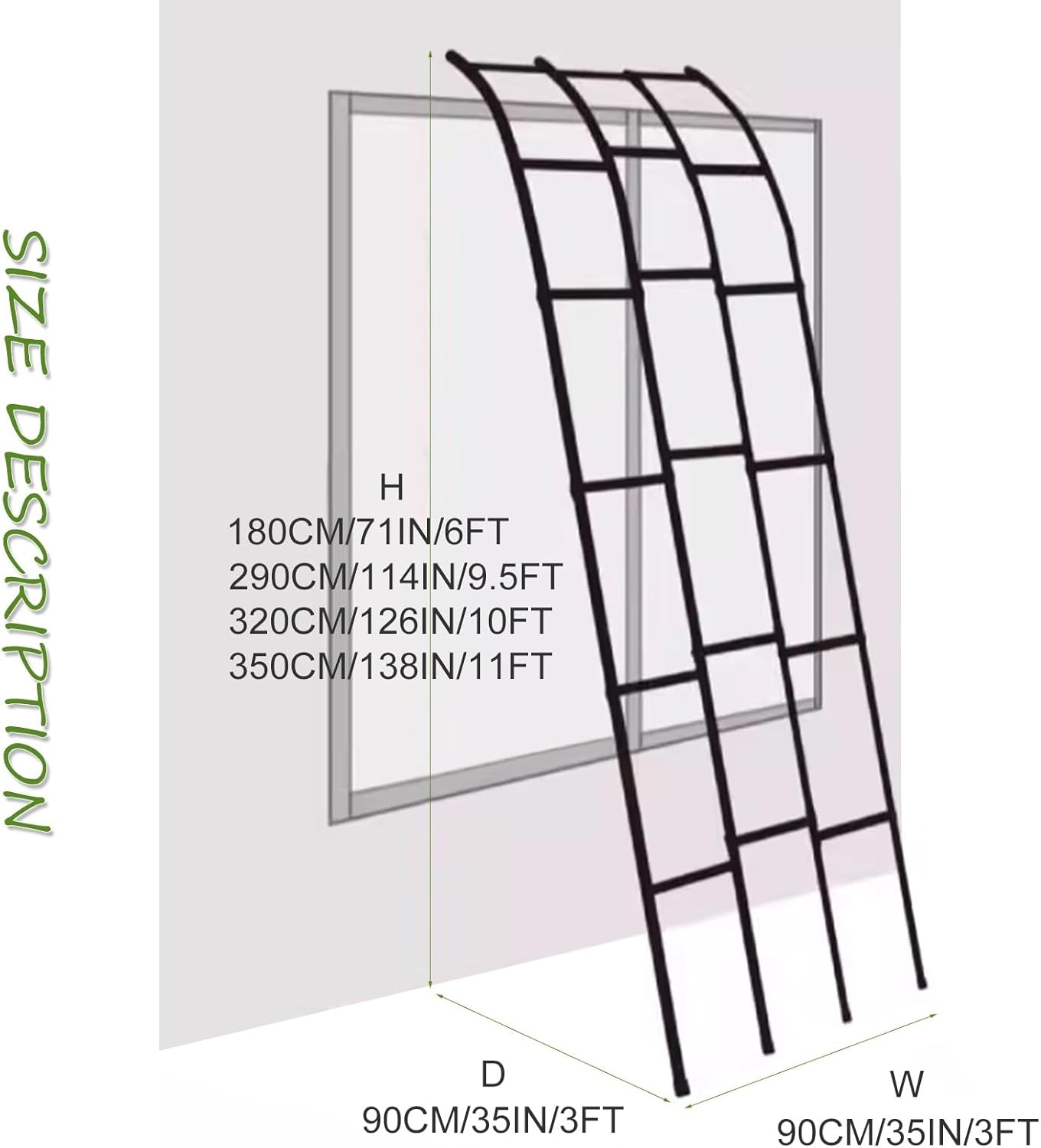 Outdoor Support Stand:This metal garden arch is the perfect addition to your outdoor space, ideal for supporting climbing plants and enhancing your garden's aesthetic. Whether you're looking to adorn your garden with beautiful flowers or create a stunning backdrop for weddings, birthday parties, or holiday celebrations, this arch serves multiple purposes while adding a touch of elegance. Designed specifically for climbing plants, this sturdy garden arch provides ample space for your favorite vines and flowers to thrive. Its versatile design not only supports plant growth but also transforms your garden or yard into a vibrant and inviting area. With its robust construction, it ensures stability and durability, making it a reliable choice for any outdoor setting. Available sizes include: - 90CM x 90CM x 180CM (3FT x 3FT x 6FT) - 90CM x 90CM x 290CM (3FT x 3FT x 9.5FT) - 90CM x 90CM x 320CM (3FT x 3FT x 10FT) - 90CM x 90CM x 350CM (3FT x 3FT x 11FT) At MCHENGMA SHOP, we prioritize customer satisfaction. If you have any questions or need assistance, please reach out to us, and we’ll respond within 10 hours. Additionally, if you're looking for a custom size, we can accommodate your needs with our high-quality manufacturing at competitive prices. your outdoor décor with this versatile metal garden arch, perfect for enhancing both the beauty and functionality of your outdoor space while providing a beautiful framework for your climbing plants.